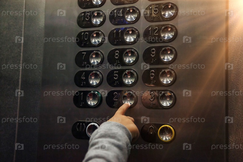 Крупным планом рука маленького ребенка нажимает кнопку второго этажа в современном лифте