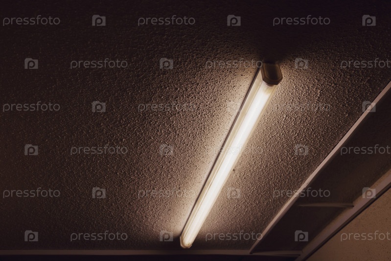 Люминесцентная лампа на потолке в многоквартирном жилом доме. Цементные потолки и люминесцентные лампы в больших зданиях. Фон для вашего креатива с надписью или логотипом. Копировать пространство
