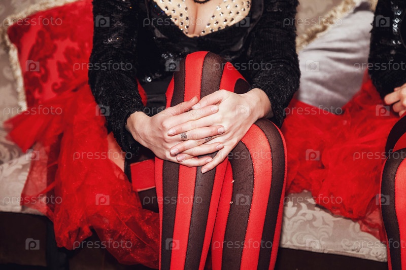 Крупный план ног артиста цирка в костюме и полосатых красно-черных чулках в гримерке. Артист цирка ждет приглашения выйти на сцену или арену. Концертное выступление для фонов