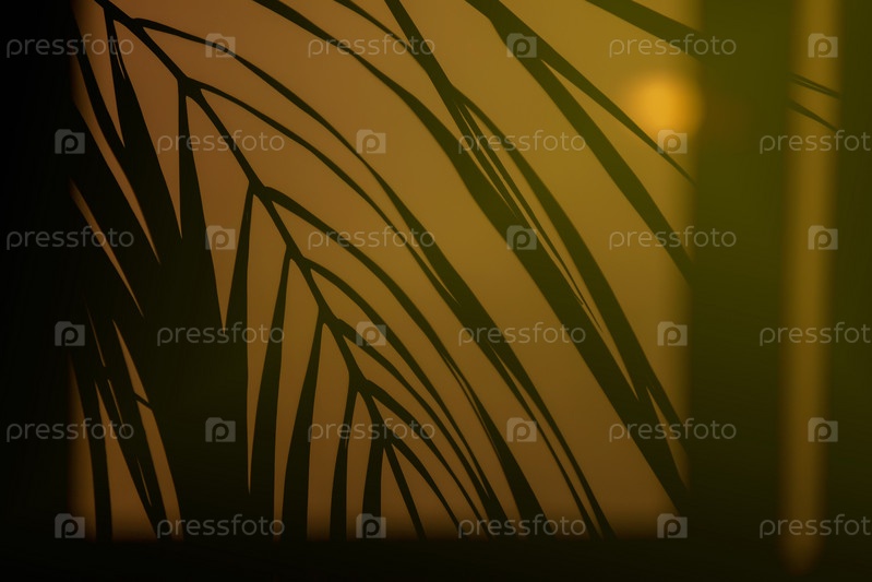 Абстрактный фон из свежих пальмовых листьев и теней у окна. Минимальный домашний интерьер для дизайна фона. Тропические пальмовые ветви и украшение бохо на закате. Концепция современной студии. Копировать пространство