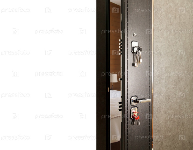 Открытая передняя деревянная или металлическая коричневая входная дверь для выхода на белом фоне изолирована. Фон для вашего творчества. Концепция открытых дверей для дизайнерской квартиры или офиса. Скопируйте место для сайта
