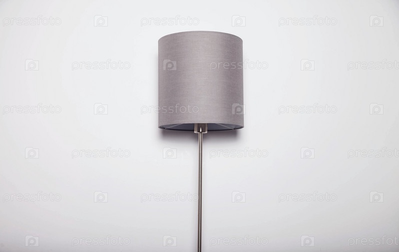 Классическая серая лампа с подсветкой с абажуром на белой стене. Традиционная лампа с абажуром в интерьере. Фоны для творчества. Скопируйте место для сайта или баннера