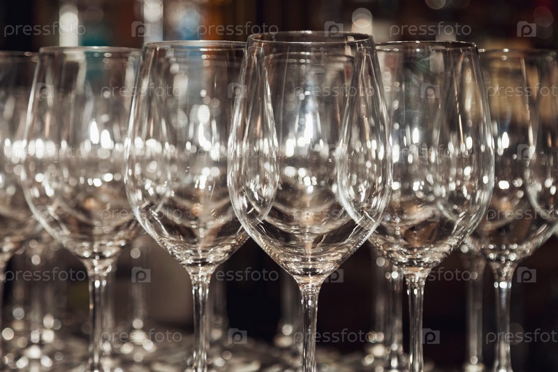 Много бокалов подряд для фона. Пустые чистые стаканы, стоящие в ряд на кухне, приготовленные барменом для церемонии шампанского. Несколько прозрачных стекол на стойке. Скопируйте место для сайта
