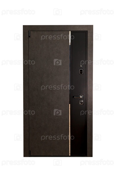 Закрытая передняя деревянная или металлическая коричневая входная дверь для выхода на белом фоне изолирована. Фоны для вашего творчества. Концепция запертых дверей для дизайнерской квартиры или офиса. Скопируйте место для сайта
