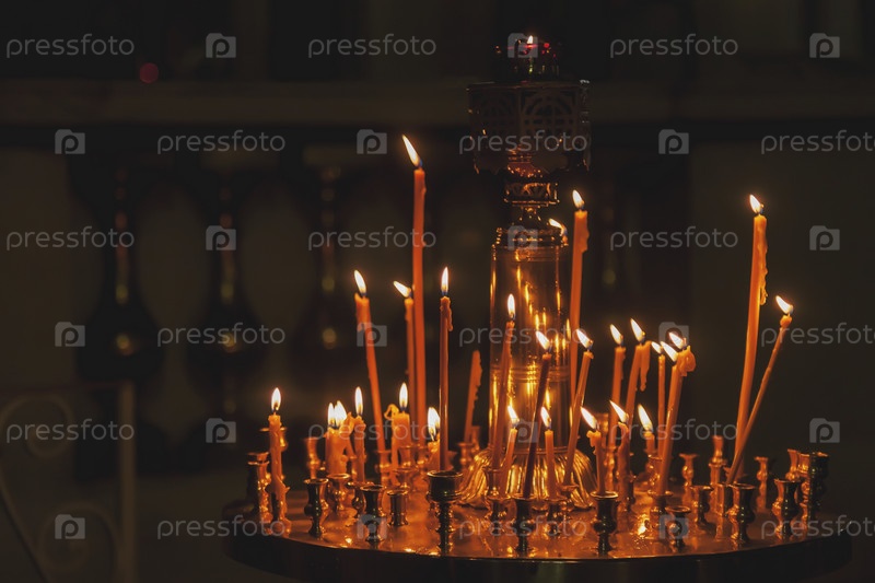 Много горящих восковых свечей в православной церкви или храме на пасхальную церемонию. Фоновые оранжевые свечи пасхальные горят в православных храмах. Концепция церковных фонов для творчества. Скопируйте место для сайта