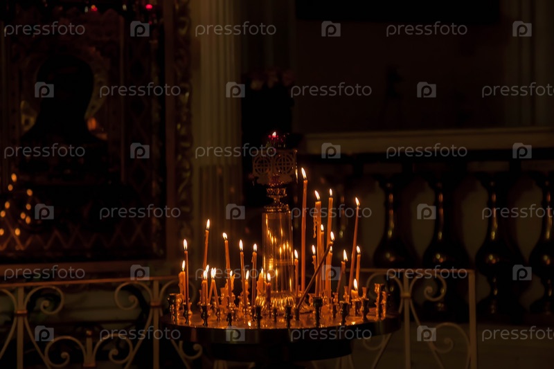 Много горящих восковых свечей в православной церкви или храме на пасхальную церемонию. Фоновые оранжевые свечи пасхальные горят в православных храмах. Концепция церковных фонов для творчества. Скопируйте место для сайта