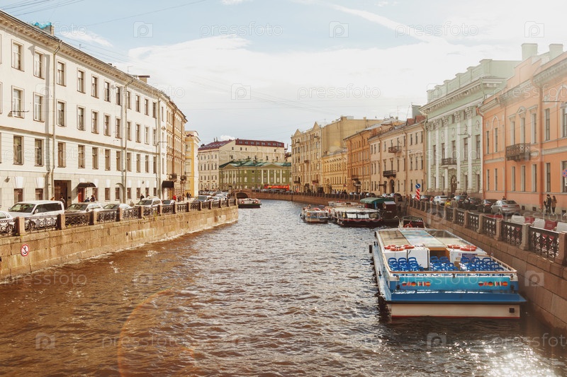Осмотрите набережную канала реки Мойки в солнечный день. Уникальный городской ландшафт центра Санкт-Петербурга. Центральные исторические достопримечательности города. Лучшие туристические места в России. Столица Российской Империи