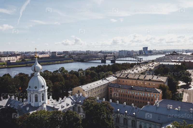 Вид с колокольни Смольного собора с куполом с крестом. Уникальный городской ландшафтный центр Санкт-Петербург. Центральные исторические достопримечательности города. Лучшие туристические места в России. Столица Российской Империи
