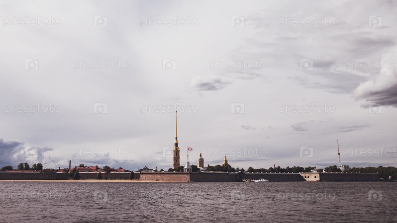 Вид на Петропавловскую крепость и реку Неву днем. Уникальный городской ландшафт центра Санкт-Петербурга. Центральные исторические достопримечательности города. Лучшие туристические места в России. Столица Российской Империи
