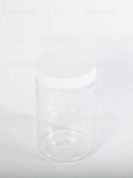 Банки для хранения сыпучих продуктов с белыми крышками на светлом изолированном фоне. Прозрачный пластиковый контейнер с крышкой для хранения продуктов питания и сыпучих продуктов. Пустая банка для еды. Копировать пространство