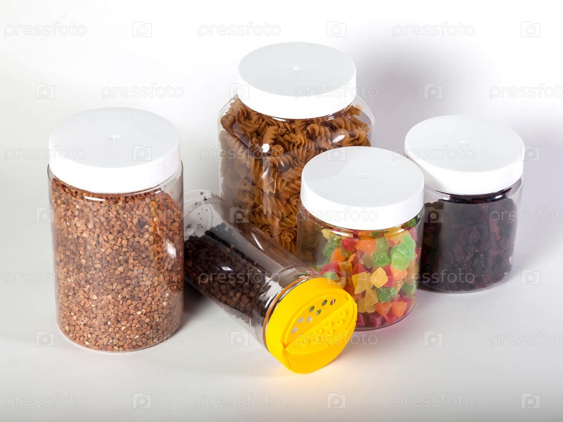 Банки для хранения сыпучих продуктов с едой на белом изолированном фоне. Прозрачный пластиковый контейнер с крышкой для хранения продуктов питания и сыпучих продуктов. Крупы и сыпучие продукты в банках для еды. Копировать пространство