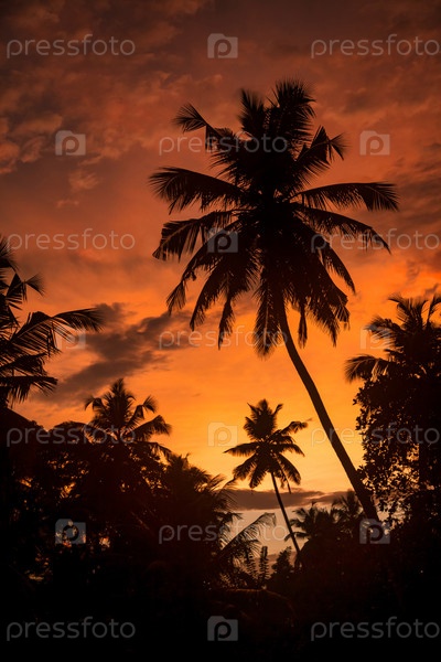 Фон тропический природный ландшафт с кокосовыми пальмами на фантастическом закате, удивительное оранжевое небо с облаками для концепции летних каникул и деловых поездок