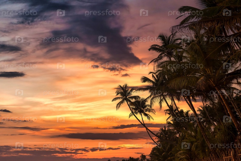 Фон тропический природный ландшафт с кокосовыми пальмами на фантастическом закате, удивительное оранжевое небо с облаками для концепции летних каникул и деловых поездок