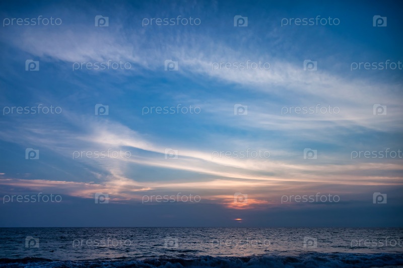 Фоновый тропический пейзаж природы с закатом на фантастическом морском пейзаже, удивительное небо на побережье океана (моря) для концепции летних каникул и деловых поездок