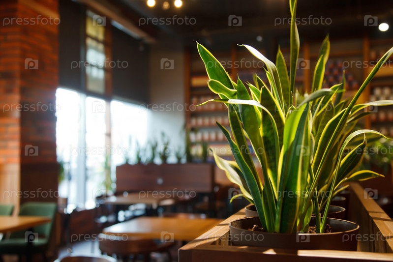 Современный уютный интерьер ресторана в стиле лофт с зелеными растениями