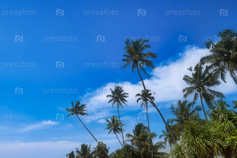Фон тропической природы с кокосовыми пальмами на фантастических морских пейзажах, удивительное голубое небо с облаками для концепции летних каникул и деловых поездок