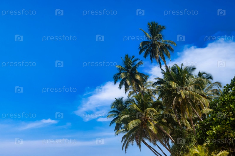 Фон тропической природы с кокосовыми пальмами на фантастических морских пейзажах, удивительное голубое небо с облаками для концепции летних каникул и деловых поездок