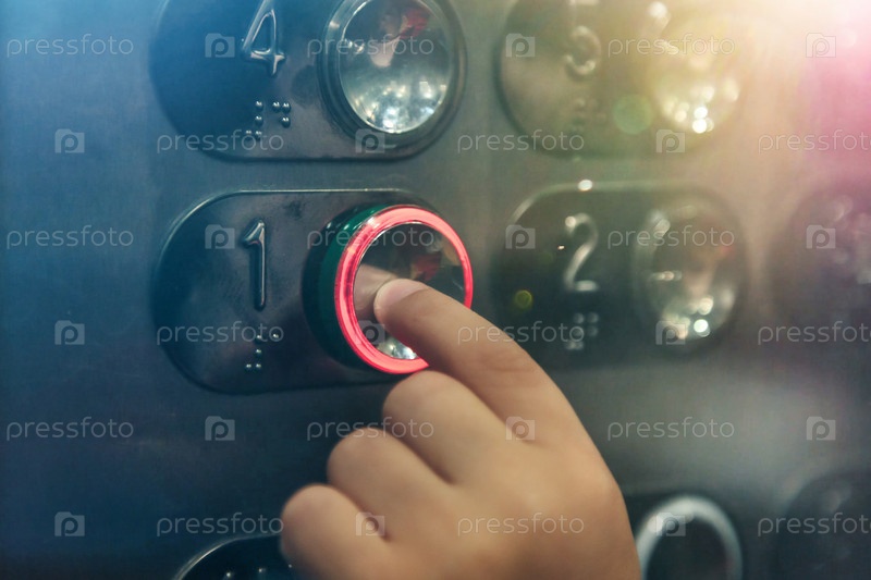 Крупным планом рука маленького ребенка нажимает кнопку первого этажа в современном лифте