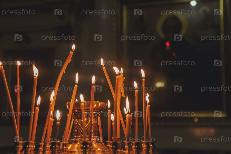 Много горящих восковых свечей в православной церкви или храме на пасхальную церемонию. Фоновые оранжевые свечи пасхальные горят в православных храмах. Концепция церковных фонов для творчества. Скопируйте место для сайта