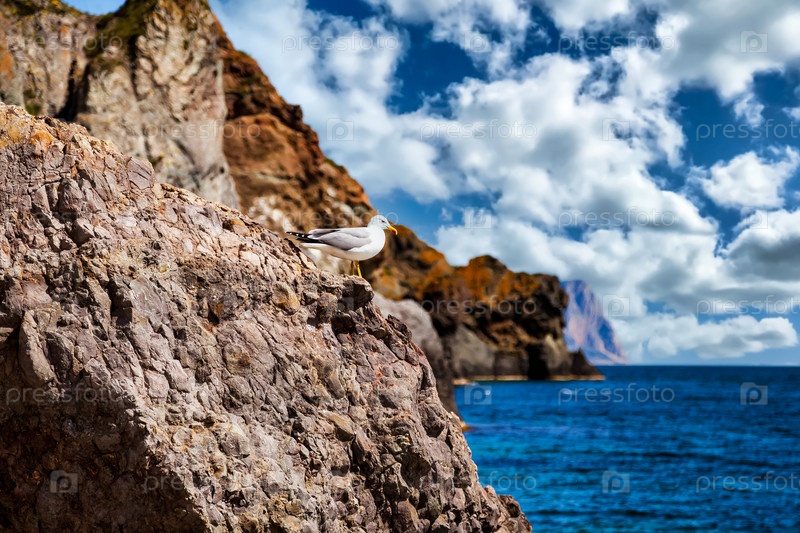 Удивительный пейзаж на побережье голубого океана в ясную солнечную погоду с чайкой