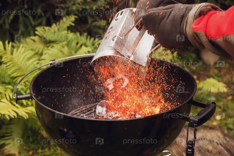 Крупным планом человек в перчатках дымоход стартера барбекю на открытом воздухе в загородном садовом домике. Пылающий горячий красный желтый угольный гриль на фоне зеленой лужайки. Концепция загородного отдыха. Копировать пространство