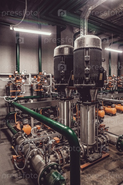 Водяная насосная станция и трубопровод с баками в промышленном помещении