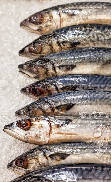 Свежие морепродукты на колотом льду на рыбном рынке