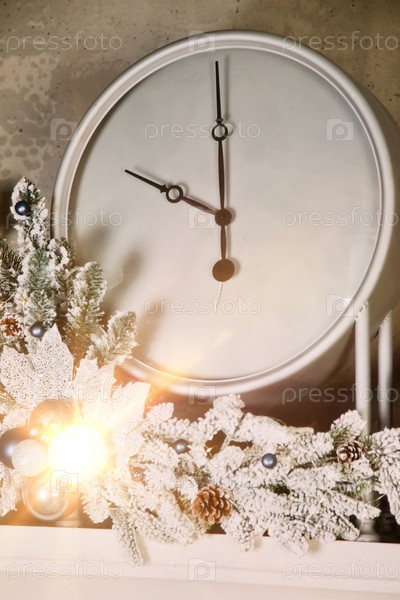 Рождественские белые часы с праздничными украшениями крупным планом на камине