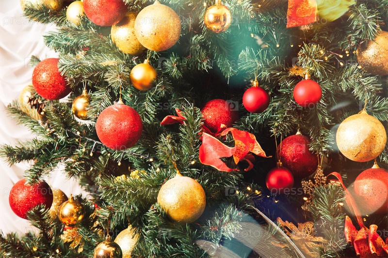 Крупным планом рождественский праздник фон украшенной елки