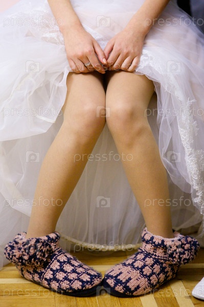 Девушка-невеста сидит с ногами под свадебным платьем без обуви