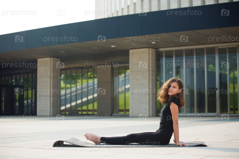 Девочка школьного возраста занимается йогой в спортивной форме, показывает элементы спорта и асан