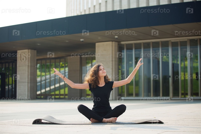 Девочка школьного возраста занимается йогой в спортивной форме, показывает элементы спорта и асан