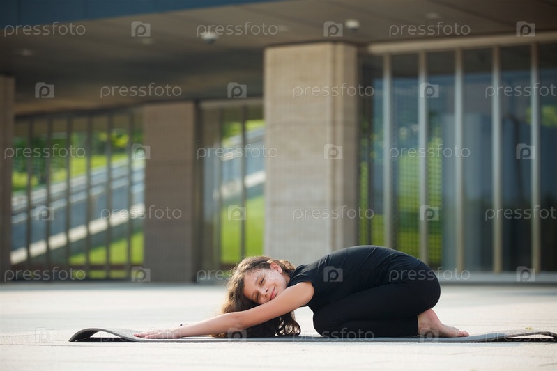 Девочка школьного возраста занимается йогой в спортивной форме, показывает элементы спорта и асан