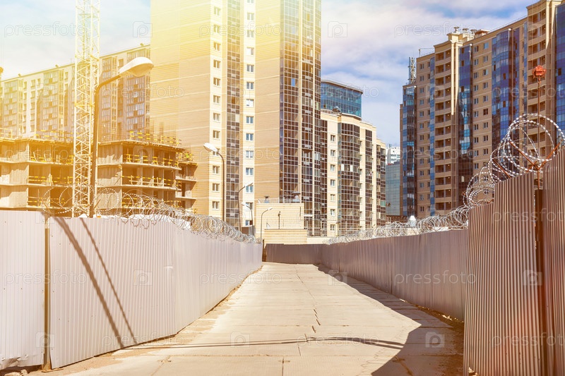 Строительная площадка с ограждением и бетонной дорогой на заднем плане