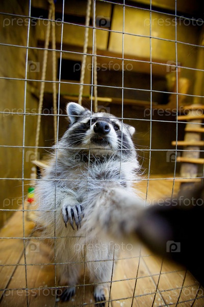 Енот в клетке тянет лапу к камере