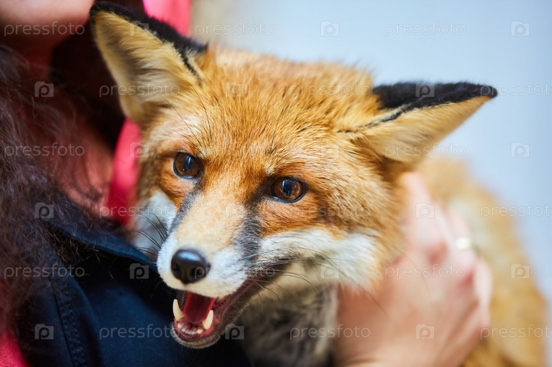 Молодой рыжий лис на руках у мужчины. Приручение диких животных