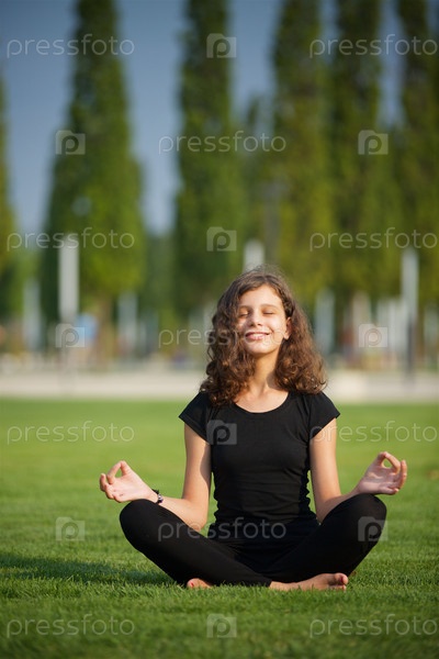 Девочка школьного возраста занимается йогой в спортивной форме, показывает элементы спорта и асан