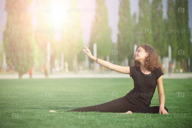Девочка школьного возраста занимается йогой в спортивной форме, показывает элементы спорта и асан