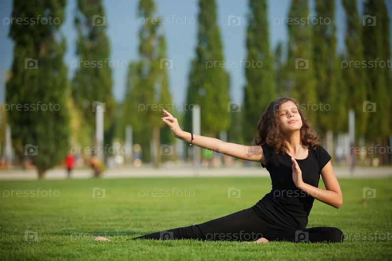 Девочка школьного возраста занимается йогой в спортивной форме, показывает элементы спорта и асан