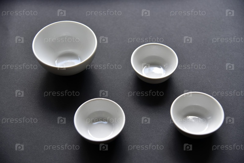 Белые фарфоровые салатницы на черном фоне. Красивые четыре белых блюдца на черном фоне