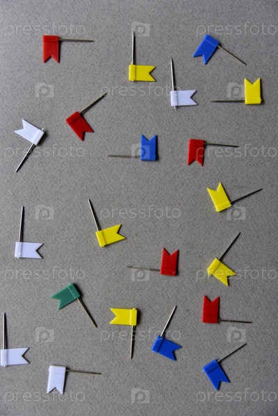 Разноцветные железные скрепки на сером фоне. Канцелярские бумажные застежки разбросаны по серому фону, как звезды