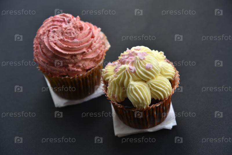 Сладкие пирожные со сливками на черном фоне. Вкусные пироги на завтрак на черном фоне