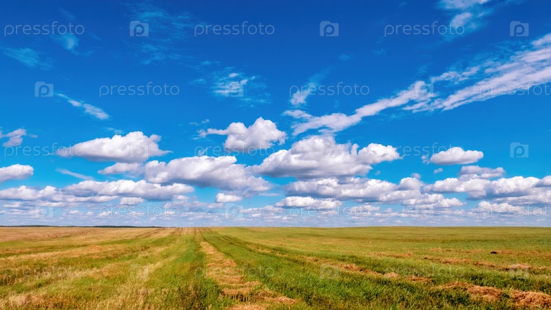 Красочные кучевые облака в ярко-голубом небе над свежескошенным полем, уходящим за горизонт. Яркий фон