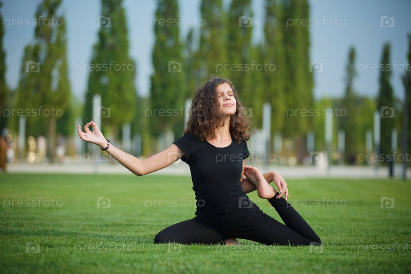 Девочка школьного возраста занимается йогой в спортивной форме, показывает элементы спорта и асан