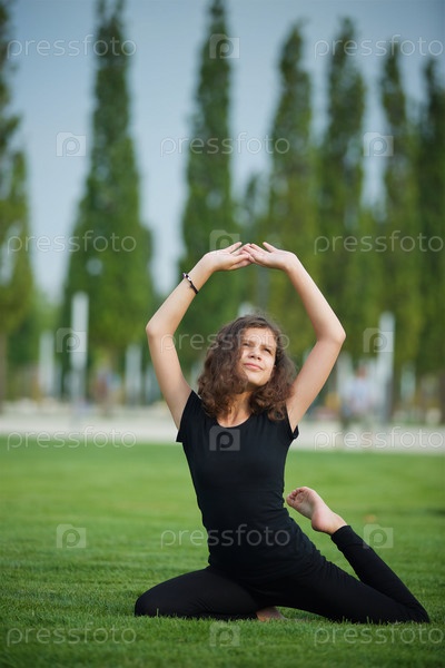 Девочка школьного возраста занимается йогой в спортивной форме, показывает элементы спорта и асан