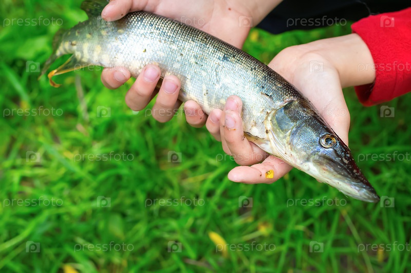 Щука попала в руки рыбака на размытом фоне зеленой травы. Концепция рыбалки в естественных реках и водохранилищах. Летняя активность. Копировать пространство