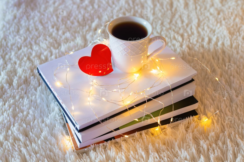 Чашка чая на стопке книг с красным сердцем и горящими гирляндами на уютном и пушистом одеяле. Концепция любви к чтению. Всемирный день любителей книги