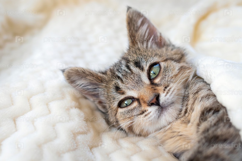Симпатичный маленький серый полосатый котенок отдыхает на кровати на теплом уютном бежевом одеяле. Концепция отдыха, релаксации, отпуска
