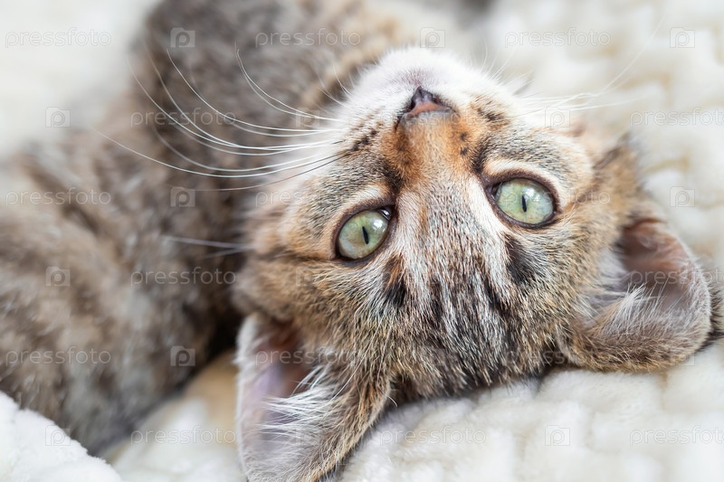 Симпатичный маленький серый полосатый котенок отдыхает на кровати на теплом уютном бежевом одеяле. Концепция отдыха, релаксации, отпуска
