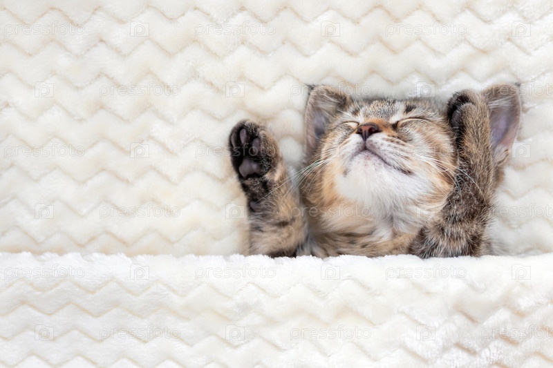 Симпатичный маленький серый полосатый котенок спит на кровати на теплом уютном бежевом одеяле. Концепция отдыха, релаксации, праздника